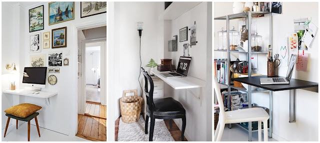 Trochę głębsza półka, zawieszona na odpowiedniej wysokości (około 70-75cm) może z powodzeniem służyć za niewielkie biurko. Oczywiście nie będzie ono na tyle wytrzymałe, żeby siadać na nie tyłkiem (if you know what I mean), ale bez problemu utrzyma laptopa, kubek z kawą i kalendarz. W ekstremalnie małych wnętrzach można rozważyć składany stolik, który, nieużywany, nie będzie zabierał miejsca. Oczywiście pozostaje pytanie, gdzie wtedy odłożysz niezbędne na biurku drobiazgi – tu znowu polecam zamontować kilka półek nad blatem – sprawdzą się idealnie, a nie pomniejszą ilości metrów kwadratowych.
