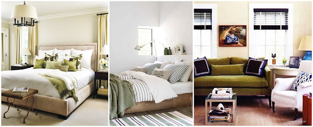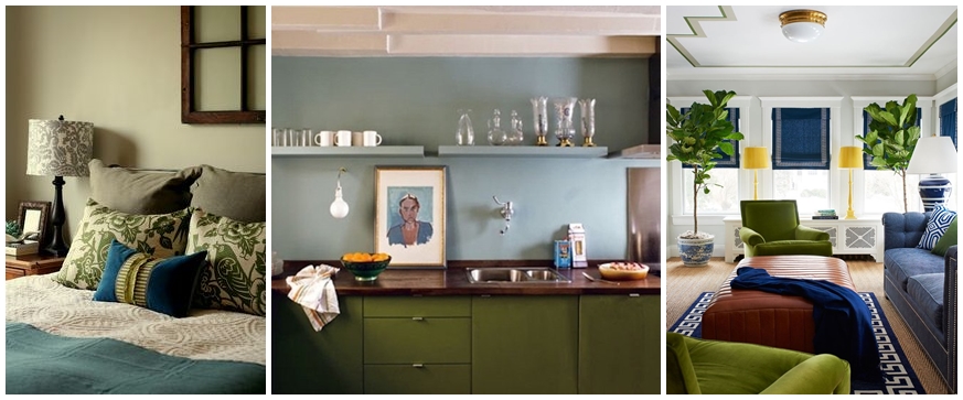 Pamiętacie, jak pisałam o petrolu? Ten kolor świetnie wygląda z oliwką! Zresztą nie tylko on – błękit i ultramaryna też rewelacyjnie odnajdzie się w towarzystwie oliwkowej zieleni. To zestaw intensywny, który dobrze wygląda w pokoju dziennym, domowym biurze a w odpowiedniej dawce, nawet w kuchni. Zdecydowanie polecam zestawienie intensywnych odcieni, w towarzystwie bieli – będzie to paleta niezwykle szykowna i nowoczesna. Wyblakłe kolory również wyglądają nieźle, choć w mojej opinii są trochę przygnębiające. Kto co lubi.