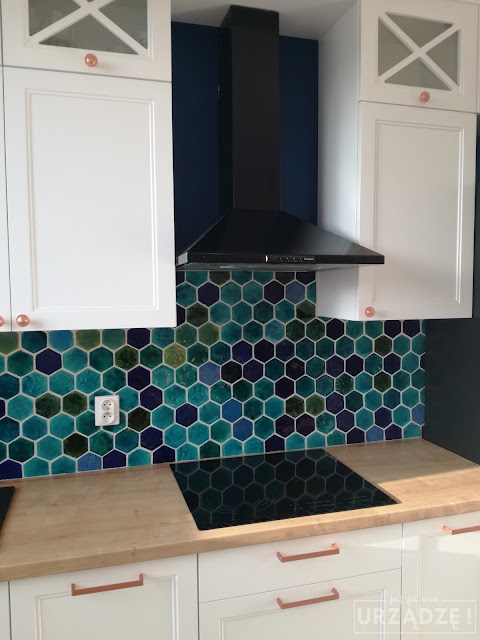 Niby tak 😉 Początkowo zastanawiałyśmy się nad blatem z okleiny imitującej rdzę – to bardzo ciekawy materiał, ale niestety średnio pasuje do klasycznej formy szafek. Stąd decyzja o postawieniu na drewno. Ale! Żeby przełamać to stereotypowe zestawienie, zdecydowałyśmy się na mocny akcent w formie drobnych płytek w intensywnym kolorze, które miały pojawić się na fartuchu kuchennym. Do tego czarne sprzęty i dodatki, oraz okucia w kolorze miedzi. Całkiem inny efekt, nie?
