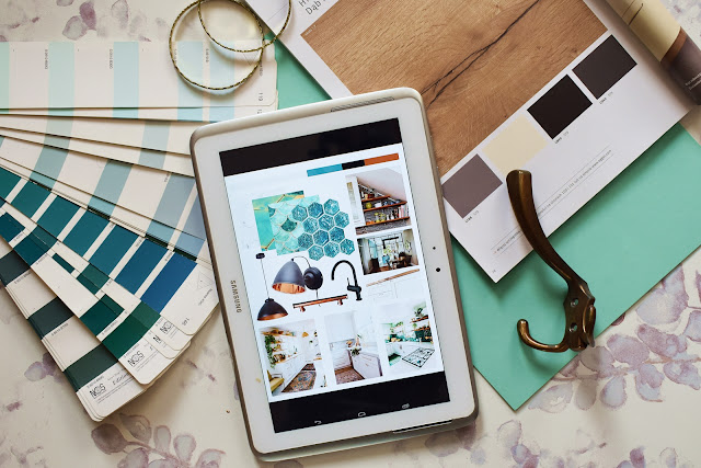 Po zatwierdzeniu projektu funkcjonalnego, przyszedł czas na moodboard. Tematem przewodnim – podobnie jak w pozostałych wnętrzach w tym mieszkaniu były chłodne odcienie niebieskiego i zielonego, miedź, biel i czerń. Moodboard prezentował się następująco:
