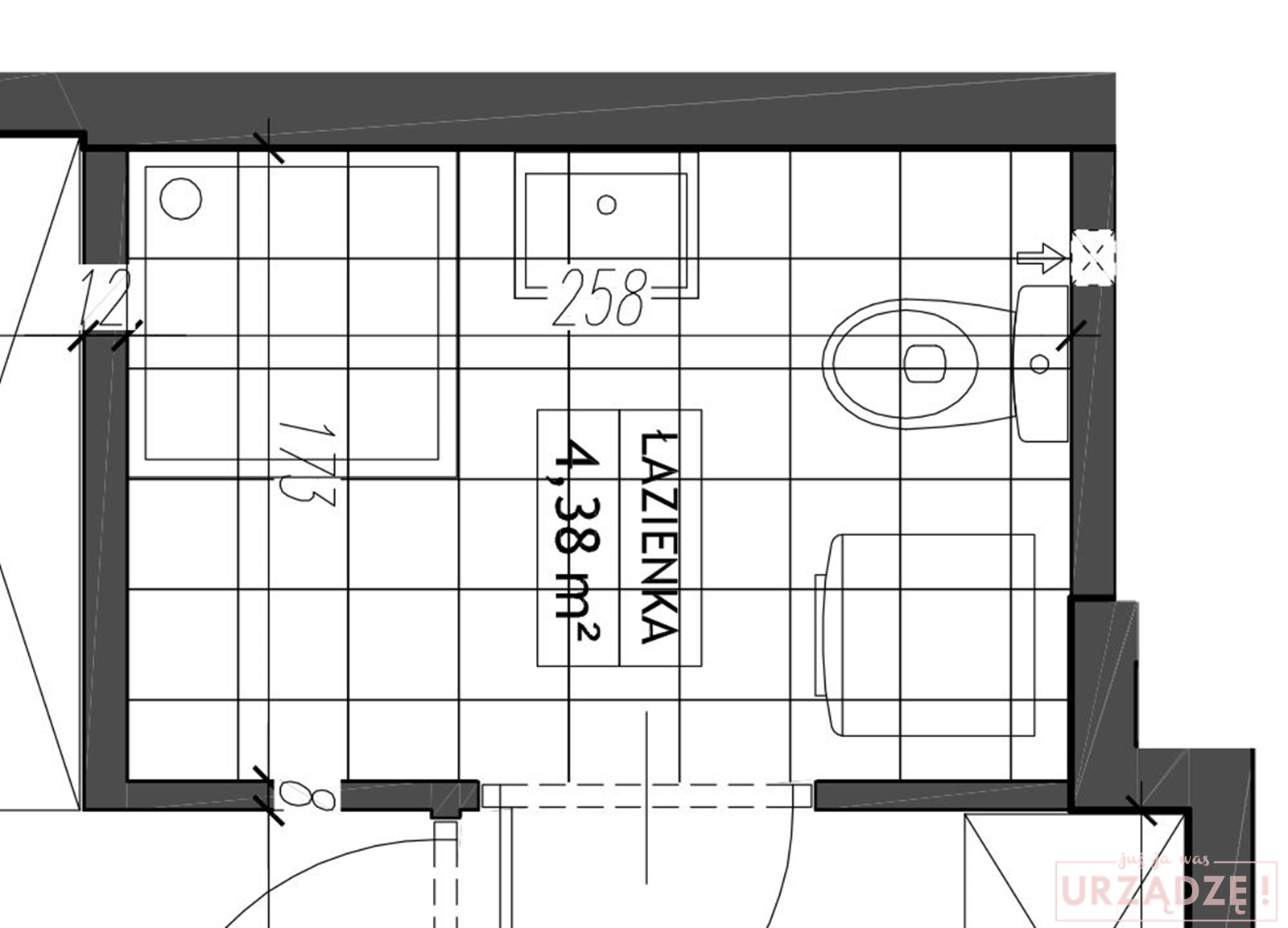 Gwiazdą dzisiejszego posta jest niewielka łazienka w bloku o wymiarach 258 na 173cm. Standardzik, nie? Na powierzchni 4,38m2 musi zmieścić się toaleta, umywalka, wanna i pralka – czyli przestrzeń jest maksymalnie wykorzystana 😉 Zerknij na poniższy rzut.