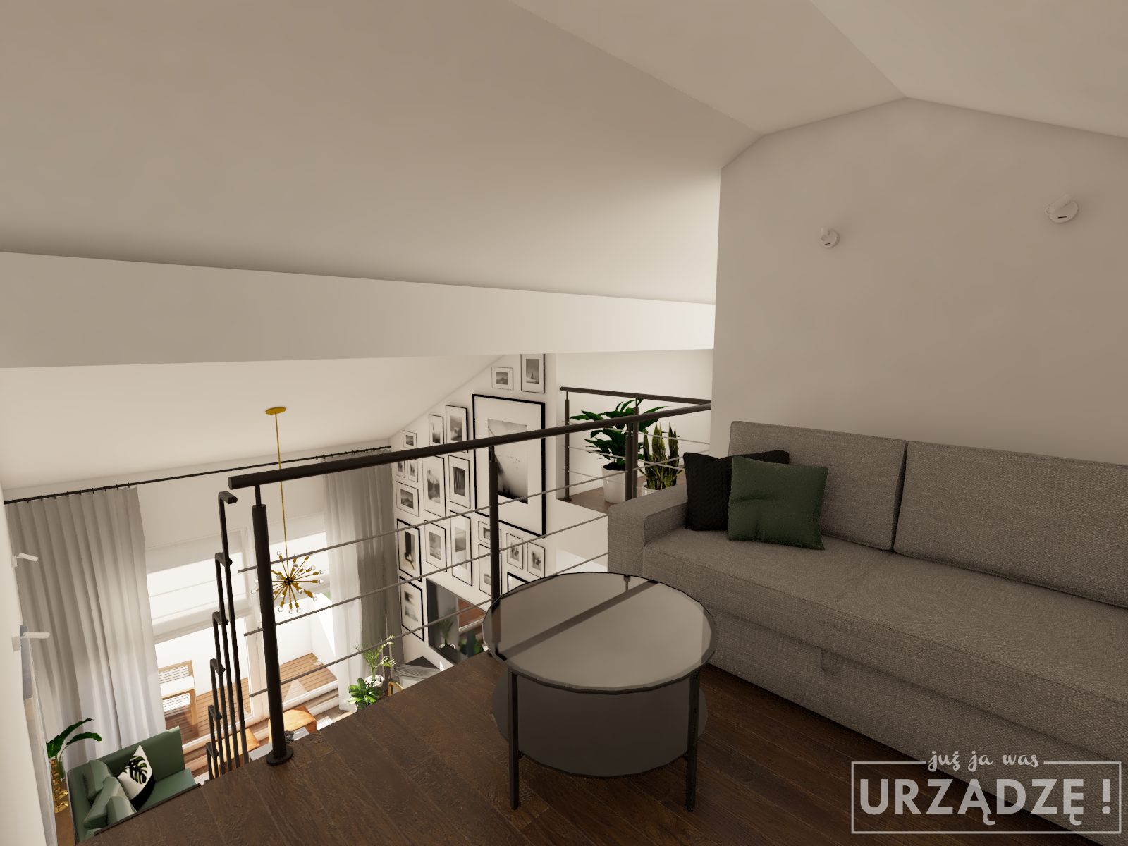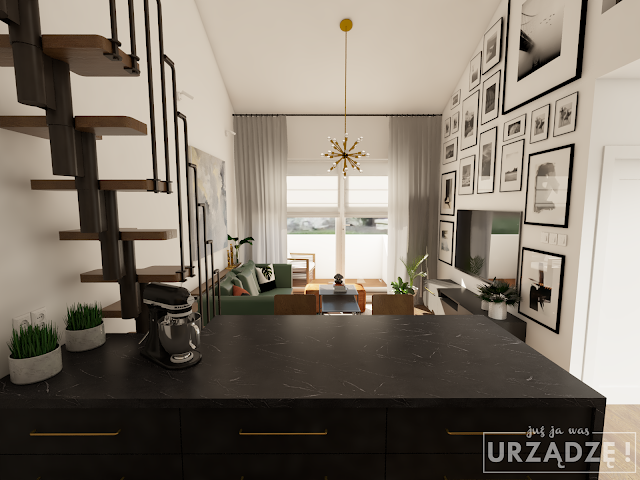Porównując moodboardy z wizualizacjami zauważysz na pewno, że wnętrza są dużo jaśniejsze, niż na moich propozycjach. Chciałam trochę poszaleć z czarnym sufitem w kuchni i zieloną ścianą na antresoli, ale klienci ostudzili moje zapędy.