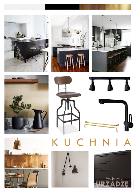 Kuchnia jest bardzo prosta – płaskie fronty, biel i czerń, subtelne uchwyty... Ale jest też twist – złoty fartuch 😉 Wykorzystaliśmy panele z IKEA, ale czekamy na ostateczny efekt – jeśli nie będzie wystarczająco “wow” pomyślimy nad innym rozwiązaniem – być może lakierowane szkło hartowane lub stiuk.
