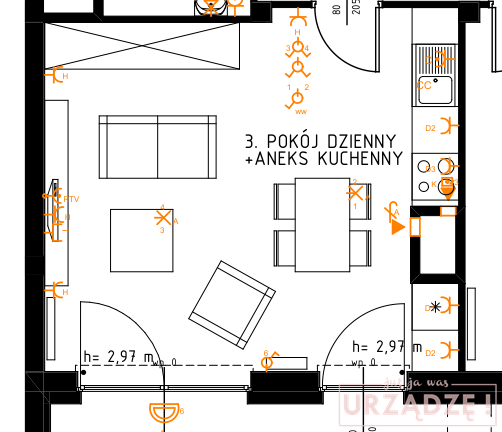 Stół postawiony został na środku (zwróć uwagę, że krzesła znajdują się praktycznie na kuchence), a kanapę ustawiono bokiem do telewizora.