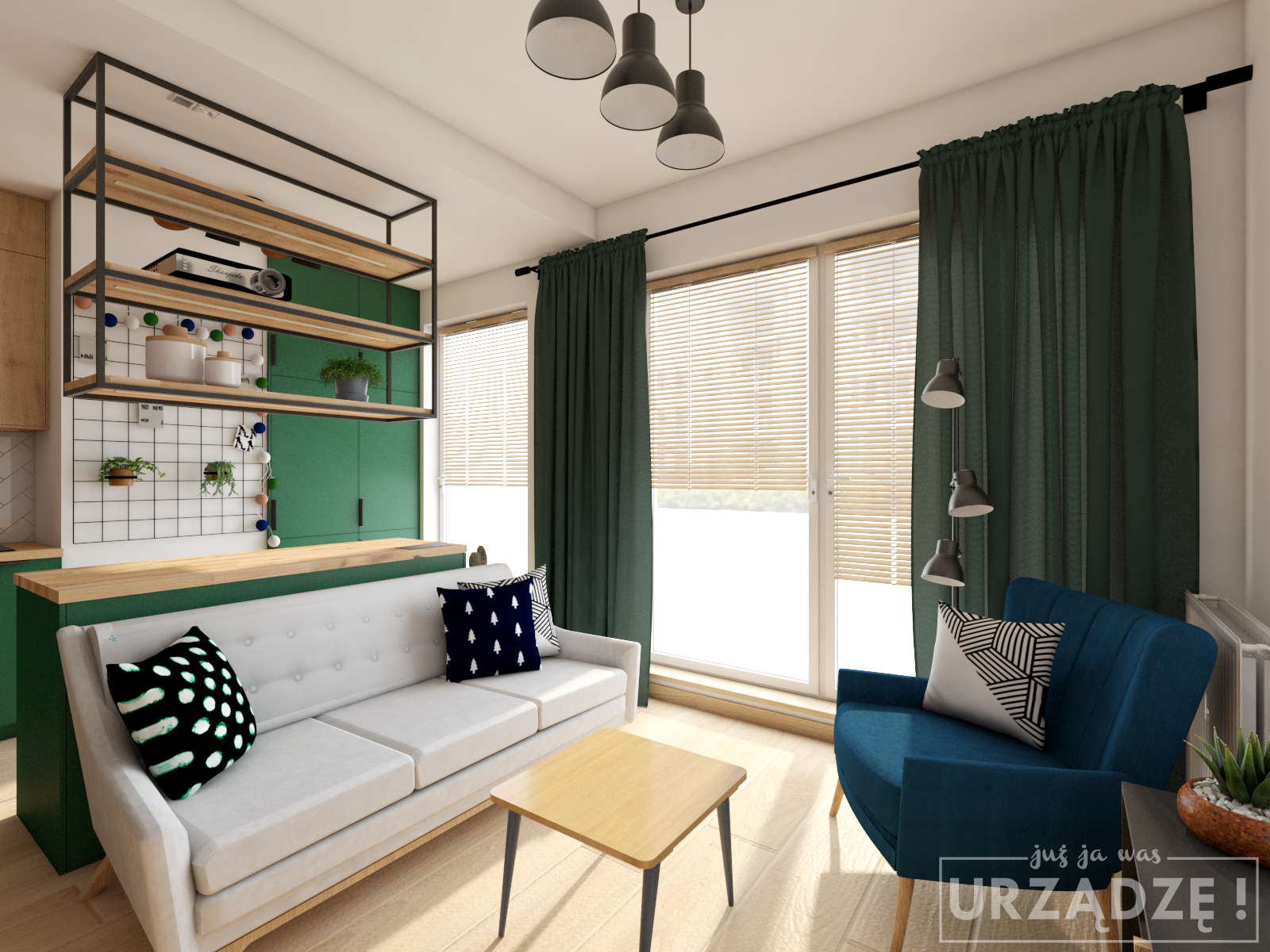 Sekretem wnętrz z tak intensywnymi barwami jest powtarzanie kolorów na różnych elementach, rozłożonych w miarę równo w całym pomieszczeniu. Dlatego naprzeciwko granatowej ściany stanął fotel o tej samej barwie, a zieleń pojawiła się nie tylko w kuchni, ale też na zasłonach i roślinach. Z kolei kontrastem dla tych zimnych barw jest ciepły kolor drewna, które właściwie dominuje nad całym wnętrzem, powodując że jest ono dobrze wyważone. Można było dodać jeszcze kilka żółtych lub musztardowych poduszek, choć ja postawiłam na wersję B&W. Dodatkowe kolory na pewno przyjdą również z książkami i dekoracjami właścicieli.