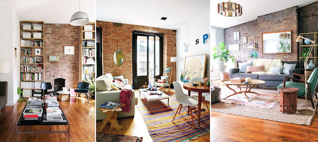 Ostatnio obserwujemy boom stylu eklektycznego. Jego głównym założeniem jest łączenie nowego ze starym, w co oczywiście cegła wpisuje się rewelacyjnie. Na jej tle eksponowane są meble z historią (czasem naprawdę długą i zawiłą), kolorowe dodatki i elektryzujące tkaniny. Całość łagodzona jest bielą pozostałych ścian i dużą ilością dziennego światła, które wpada przez ogromne okna.