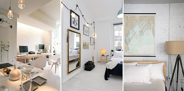 Mówiąc o cegle nie mogłabym pominąć oczywiście stylu skandynawskiego! Jego założenia pojawiały się już niejednokrotnie na moim blogu – biel, biel, biel. Cegła także oberwała bielą. Nie spowodowało to jednak zakrycia jej struktury – wręcz przeciwnie. Pokrycie cegły jednym kolorem spowodowało, że jest ona znacznie mniej przytłaczająca, dzięki czemu możemy sobie pozwolić na użycie jej w większej ilości. W połączeniu z jasną podłogą jest pięknym tłem dla wyeksponowania ciekawych mebli i dodatków, których w stylu skandynawskim nie brakuje.