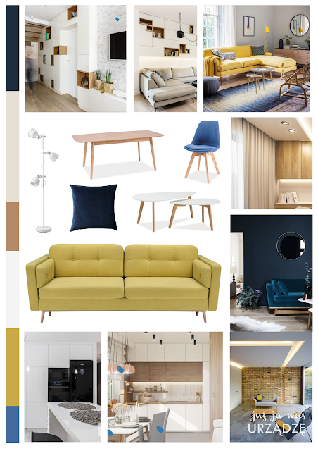 zdjęcia z kolorystyką, którą planuję – granatowa ściana i żółta kanapa,
