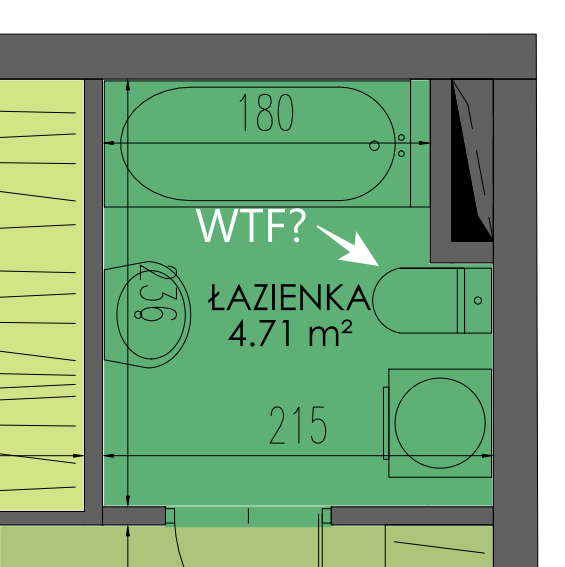 Mnie nie spodobał się szacht rozdzielający aneks od części wypoczynkowej, bo jak wiadomo – takiego elementu nie da się zmienić ani przesunąć – ale ostatecznie zdecydowaliśmy, że nie jest to tak duży problem, by przez niego rezygnować z tego mieszkania. Drugą sprawą było dziwaczne umiejscowienie toalety, w kącie przy drugim kominie wentylacyjnyme. Wyobrażasz sobie usiąść na tej misce? Nie wiem, może jakoś bokiem? Usytuowanie to jest dla mnie szczególnie dziwne z tego powodu, że na tej ścianie jest wystarczająco dużo miejsca, żeby odsunąć toaletę od szachtu na wymagane 20cm. Ale nie, lepiej odsunąć pralkę 😉 Mam wrażenie, że architektowi po prostu krzywo wkleiły się bloki.