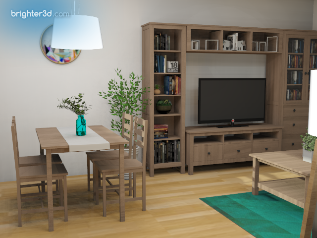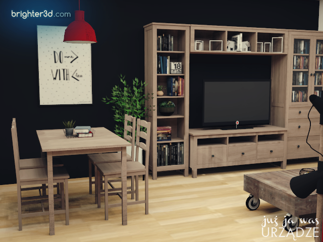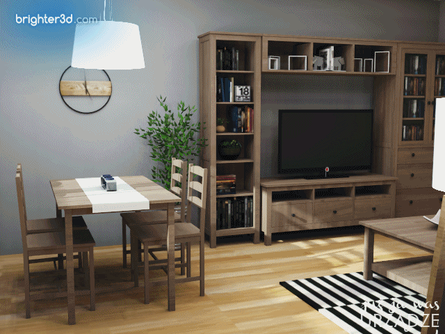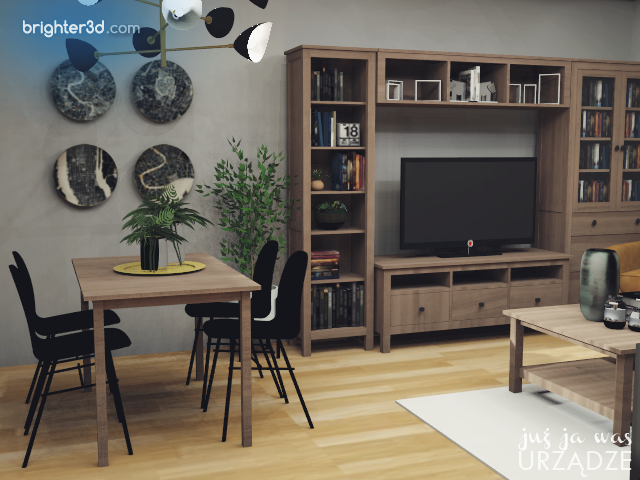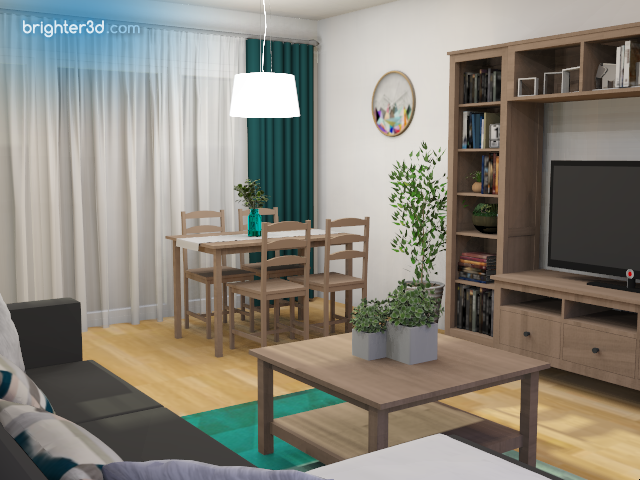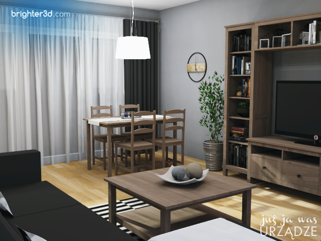 W naszym salonie szary spotyka się z ciepłym odcieniem drewna, więc dodatkowe ocieplanie nie będzie konieczne. Głównym akcentem będzie ciemna, morska ściana za kanapą i zasłony w podobnym kolorze. Reszta, to już tylko drobiazgi – dowodzi to, że żeby dodać życia do wnętrza, nie trzeba wcale wywracać portfela na drugą stronę.