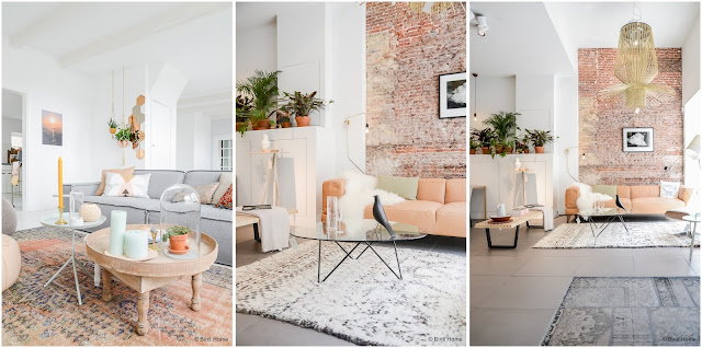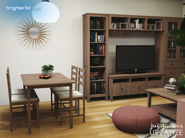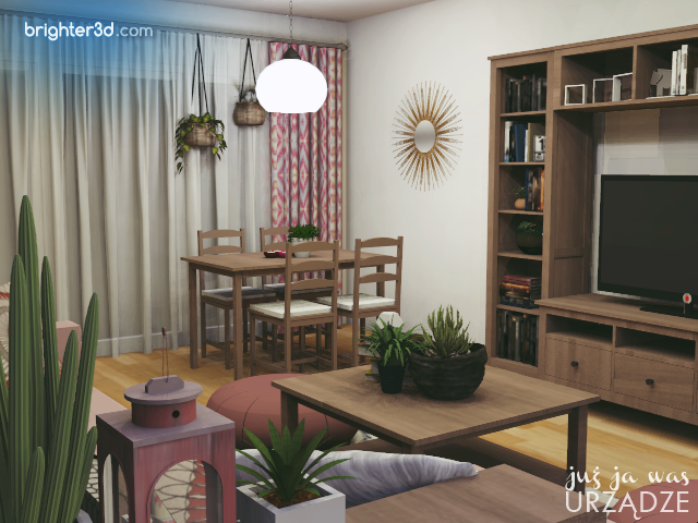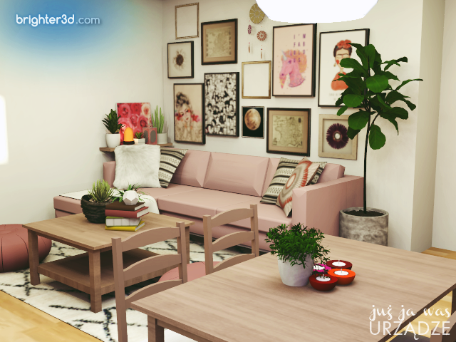 Znów zmieniłam kolor kanapy – jak wiesz, różowa tapicerka jest moją ostatnią obsesją, więc nie mogłam odpuścić sobie wypróbowania jej w tym projekcie. Poza tym, pojawiło się mnóstwo dodatków bardzo charakterystycznych dla tego stylu – futrzaste poduszki, miękki dywan, nieuporządkowana galeria ścienna, czy okrągłe pufy leżące na podłodze. Wszystko to sprawia wrażenie nieporządku, ale cóż… Boho rządzi się swoimi prawami. Fajnym elementem jest też półka umiejscowiona zaraz obok podłokietnika kanapy – to bardzo wygodne rozwiązanie dla rzeczy, które zawsze chcesz mieć pod ręką.