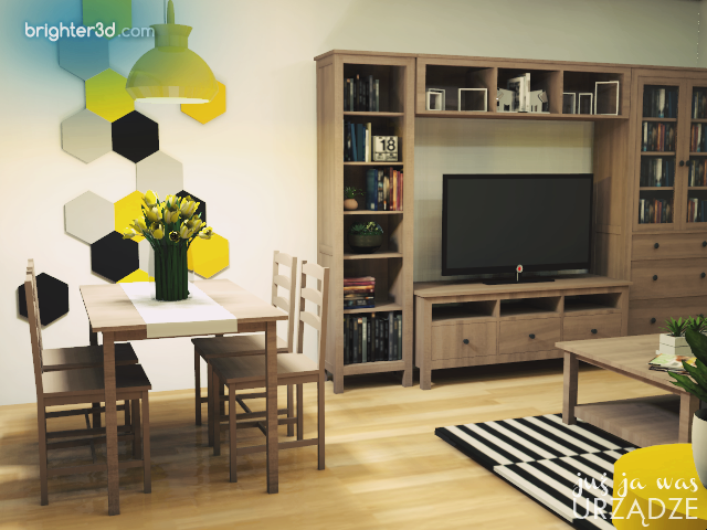 W tej stylizacji postawiłam na nowoczesne, geometryczne kształty i kilka dodatków w intensywnym odcieniu żółtego. Zmieniło się między innymi oświetlenie – teraz nad stołem wisi duża, metalowa, żółta lampa, a kanapę oświetla lampka biurowa stojąca na półce.