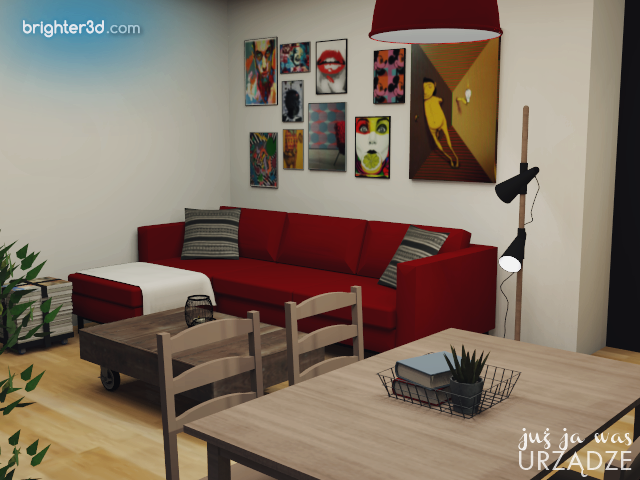 Na tym ujęciu świetnie widać proporcje, o których już wspominałam. Czerwień nie jest ulubionym kolorem urządzających wnętrza, ponieważ mówi się o niej, że powoduje nerwowość, że nie pozwala na odpoczynek. Bzdura 😉 W odpowiedniej ilości będzie działać motywująco i energetyzująco. Przecież salon nie służy tylko zaleganiu na kanapie, mam rację?