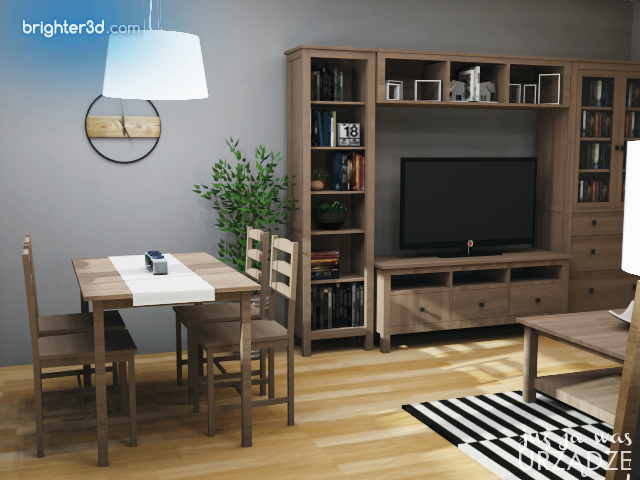 We wnętrzu, jak w każdym przeciętnym salonie stoi zabudowa RTV (tu regały HEMNES z IKEA), drewniany stół z krzesłami, narożnik i stolik kawowy. Dodatki też są proste – białe lampy, pasiasty dywan, bieżnik, kilka drobiazgów na stole i półkach. Ogólnie – całkiem zwykły i raczej nudny salon.