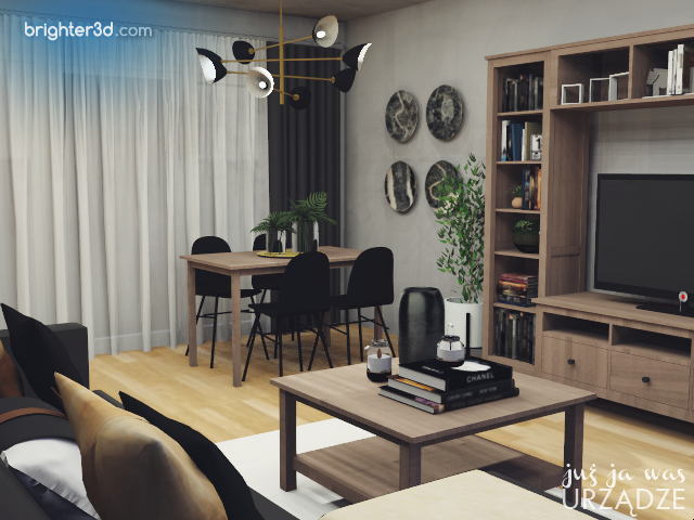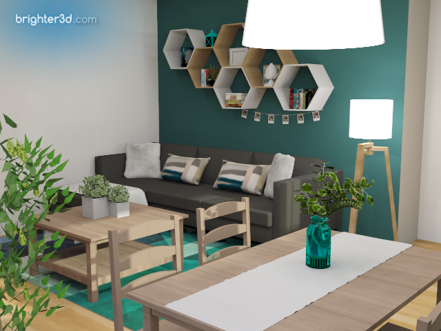 W naszym salonie szary spotyka się z ciepłym odcieniem drewna, więc dodatkowe ocieplanie nie będzie konieczne. Głównym akcentem będzie ciemna, morska ściana za kanapą i zasłony w podobnym kolorze. Reszta, to już tylko drobiazgi – dowodzi to, że żeby dodać życia do wnętrza, nie trzeba wcale wywracać portfela na drugą stronę.