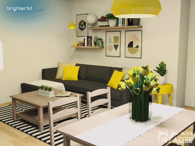 W tej stylizacji postawiłam na nowoczesne, geometryczne kształty i kilka dodatków w intensywnym odcieniu żółtego. Zmieniło się między innymi oświetlenie – teraz nad stołem wisi duża, metalowa, żółta lampa, a kanapę oświetla lampka biurowa stojąca na półce.
