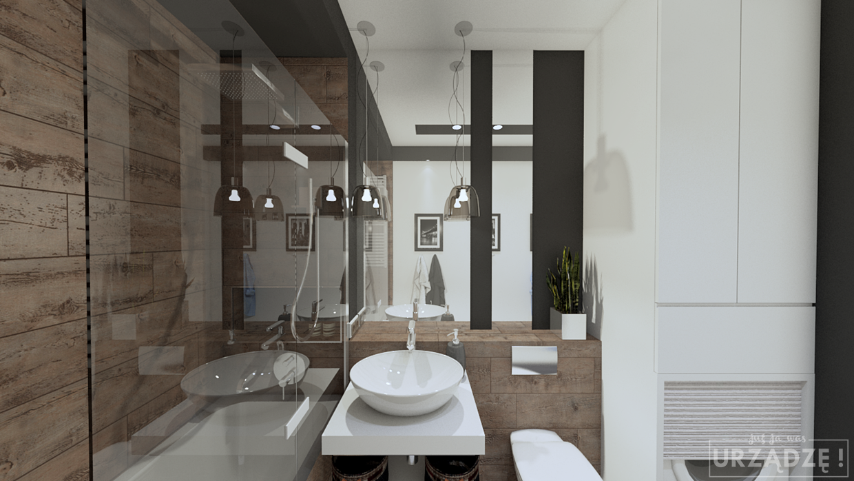 Żeby była jasność – ja też używam tych trendów przy projektowaniu mieszkań dla moich klientów! Generalnie nie ma nic złego w korzystaniu z bieżących nurtów, o ile dopasujesz je pod siebie i wzbogacisz o swój indywidualny charakter. Nie odgapiaj, nie przerysowuj kreska w kreskę znalezionego gdzieś schematu – wybierz z niego to, co podoba Ci się najbardziej i weź to coś na warsztat. Pobaw się i poeksperymentuj. To trochę jak z tą łazienką poniżej – niby drewno, biel i szarość – te same materiały, które używane są w większości projektów, ale jednak odstaje ona trochę na tle innych realizacji.