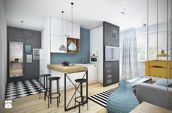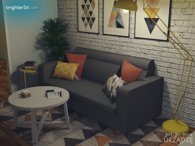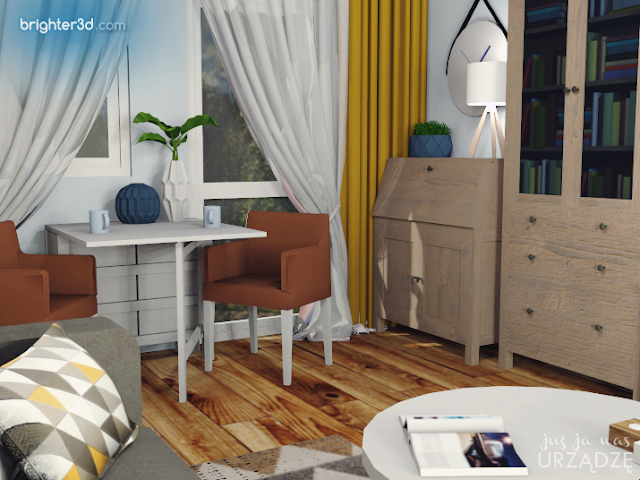 Zdecydowałam się na jednolite, musztardowe zasłony, które świetnie kontrastują z błękitnymi ścianami i wzorzysty dywan, spinający salon w całość. Do tego oczywiście kolorowe poduszki w geometryczne wzory, które nadadzą szarej kanapie wyrazu. Ze względu na to, że tło jest dość spokojne, mogłam poszaleć z różnymi wzorkami i kolorami. Jest życie!