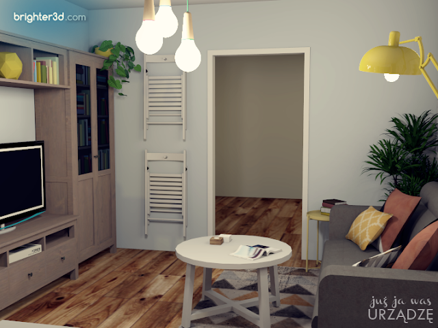 Salon przed zmianami był dość ciemnym pomieszczeniem. Przemalowanie ścian na pewno nieco poprawi stan rzeczy, ale dodatkowe oświetlenie również się przyda. Ciekawa, designerska lampa przy kanapie nie tylko doda wnętrzu smaku, ale tez pozwoli na stworzenie miłego klimatu wieczorem. Mało oryginalne oświetlenie górne zastąpiłam zwisem z trzech żarówek – dadzą więcej światła, a ich industrialny charakter świetnie wpasuje się w styl wnętrza.