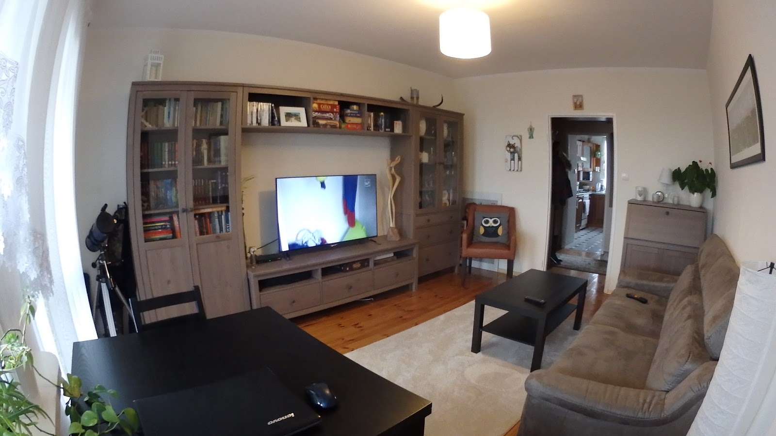 Układ funkcjonalny jak na tak niewielkie pomieszczenie rozwiązany jest dość dobrze.. Mam jednak wrażenie, że stół stojący na wejściu do kolejnego pomieszczenia trochę przeszkadza przy przejściu. Kasi na pewno nie raz zdarzyło obić o niego biodro 😉 Sekretarzyk również nie jest ustawiony w najbardziej fortunnym miejscu – ze względu na kanapę, nie można dostawić do niego żadnego siedziska. Przez to nie może pełnić swojej pierwotnej funkcji.