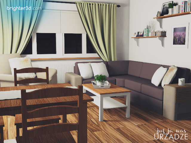 Układ funkcjonalny we wnętrzu uległ niewielkim zmianom. Szafa schowała się za drzwiami wejściowymi, a na jej boku znalazło się miejsce na wieszak na złożoną deskę do prasowania. Naprzeciw wejścia stoi teraz witrynka oraz stół z krzesłami – zaplanowałam je bezpośrednio obok siebie, ponieważ zrobione są z tego samego gatunku drewna. Taki zabieg sprawi, że różnorodność mebli trochę się zgubi. Narożnik pozostał na swoim miejscu, natomiast wielki fotel wcisnęłam do kąta.