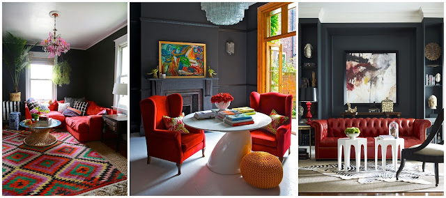 Tego zestawu użyłam w jednej z propozycji w poście o tym, jak ożywić szare wnętrze. Oczywiście, pomieszczenie w tych kolorach będzie ciemne. Oczywiście, nie każdy się w nich odnajdzie. Ale dla odważnych, którzy chcą trochę poeksperymentować, zdecydowanie polecam. Użycie czerwonego koloru w ciemnym wnętrzu doda mu energii i rozświetli go, lepiej niż jakikolwiek inny kolor. Pokoje z inspiracji są bardzo interesujące, przyciągają uwagę i zatrzymują wzrok – nie chciałabyś takiego salonu u siebie w mieszkaniu?