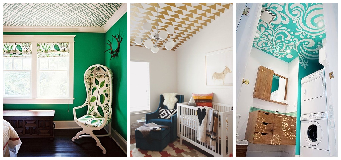 Jeśli jednak kolorowy sufit to dla Ciebie za mało, poniżej wrzucam kilka wzorzystych inspiracji. Niezły pomysł, zamiast tapetować ściany czy kupować sofę w kwiaty czy kratę, można wzór rzucić na sufit. Mocno przyciąga wzrok, nie sądzicie?