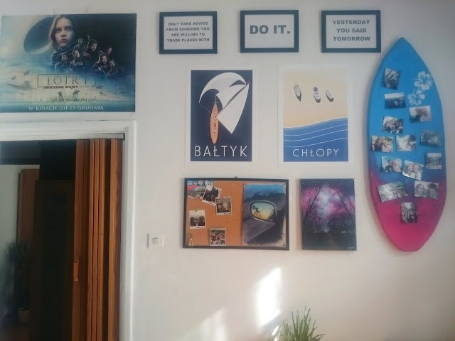 Deska surfingowa, na której przypięte są zdjęcia była rekwizytem na zeszłorocznych juwenaliach – ma więc w sobie mnóstwo pozytywnej energii i wzbudza bardzo miłe wspomnienia. To mój ulubiony element na tej ścianie!