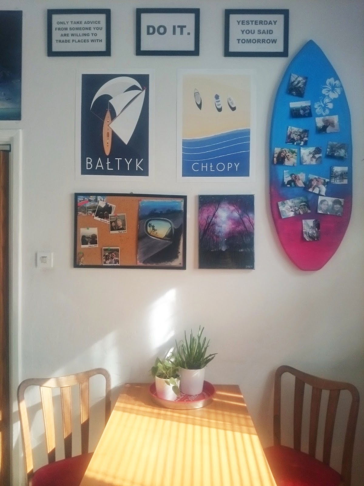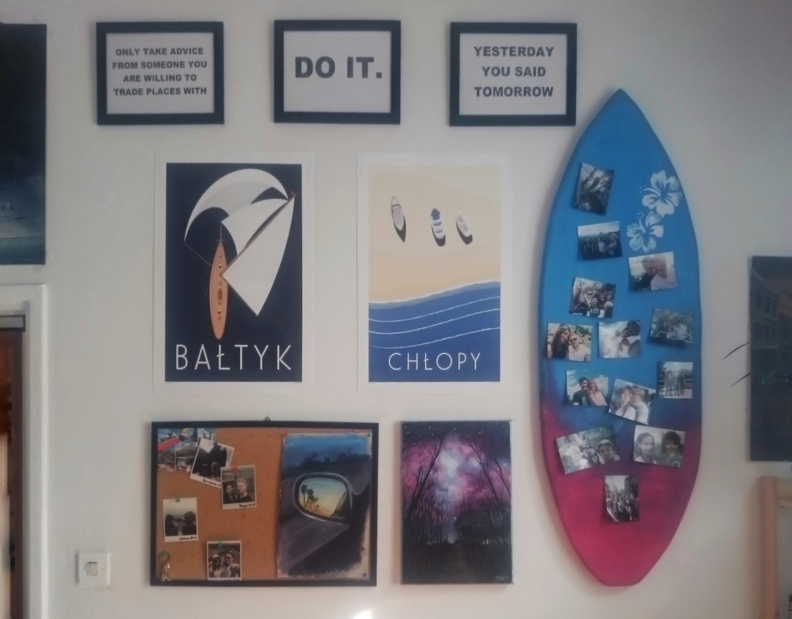 Deska surfingowa, na której przypięte są zdjęcia była rekwizytem na zeszłorocznych juwenaliach – ma więc w sobie mnóstwo pozytywnej energii i wzbudza bardzo miłe wspomnienia. To mój ulubiony element na tej ścianie!