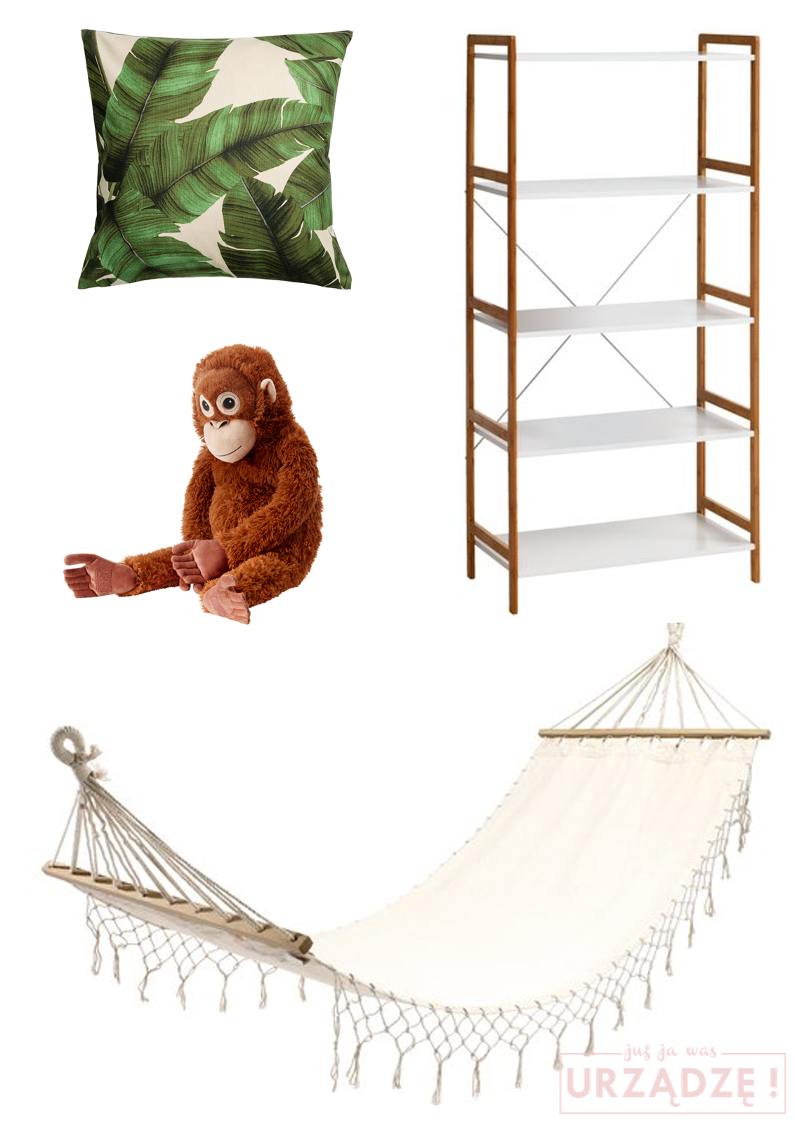 Poszewka na poduszkę H&M HOME 39,90zł | Pluszowa małpa DJUNGELSKOG IKEA 29,99zł | Regał BROBY JYSK 299zł