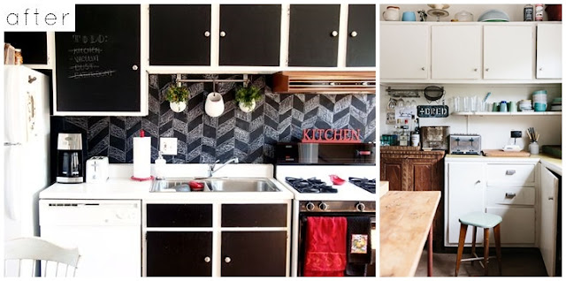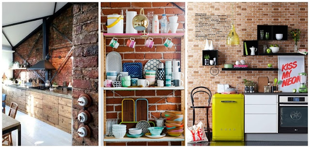 Częstym problemem jest przestrzeń pomiędzy dolnymi a górnymi szafkami kuchennymi. Ściana albo nie jest zabezpieczona wcale, albo ma wybiórczo naklejone kafle (brr, ja tak mam), czasami zdarzy się obklejona koszmarnymi płytkami z minionej epoki. Cóż… wyjść jest kilka. Ścianę (lub nawet kafle) można pomalować farbą na inny kolor. Można nakleić wodoodporną tapetę, lub też przykręcić perforowaną płytę mdf, która będzie przy okazji służyć jako przybornik. Warto zastanowić się nad użyciem farby tablicowej, dzięki czemu zyskamy od razu miejsce na zapiski. Po amerykańskiej stronie internetu widziałam też niezłe rozwiązanie z panelami, które imitowały cegłę, ale nie wiem, jak z dostępnością takich cudów w Polsce. Niemniej, ciekawy pomysł.