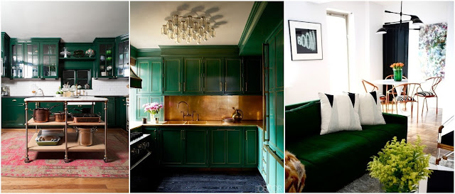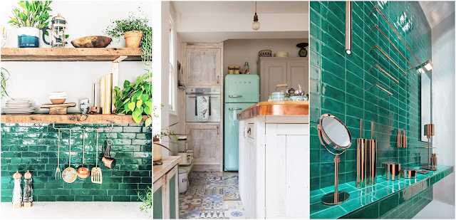 Szmaragdowa zieleń pojawiła się u mnie już w poście o kolorowych kuchniach. Wspominałam wtedy, że pasuje do miedzi. Tym razem postanowiłam Ci to udowodnić 😉 Jest to dość ciężka paleta, która może przytłaczać niektóre wnętrza. Jednak w dużym, dobrze oświetlonym pomieszczeniu powinna sprawdzić się rewelacyjnie. Co więcej, można ją zastosować praktycznie w każdym stylu – idealnie pasuje do wnętrz rustykalnych, czy nawet wypełnionych antykami, ale dobrze wyglądać będzie także w stylu skandynawskim, eklektycznym, a nawet całkiem nowoczesnym. Wszystko zależy od proporcji, jakich użyjemy w danym wnętrzu. Spójrz na zdjęcia!