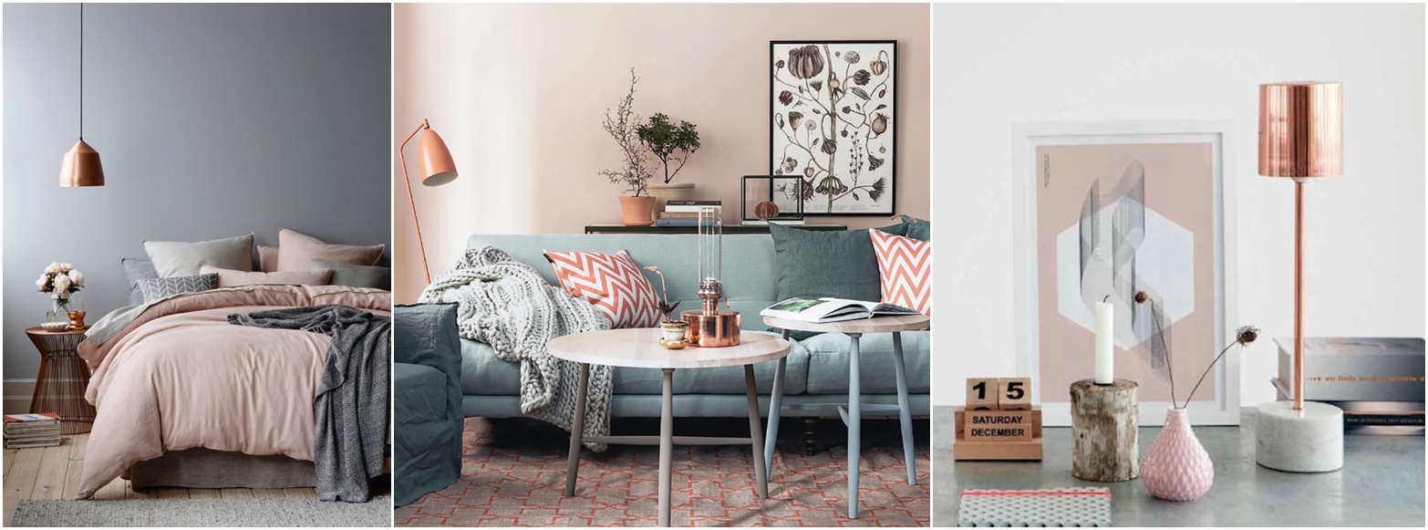Jak wspominałam wyżej, początkowo nie byłam przekonana do tego duetu, jednak inspiracje, jakie wyszukałam zupełnie zmieniły moje podejście. No bo, sami spójrzcie, jak świetna i delikatna jest ta paleta! Taka pudrowa, nienarzucająca się, a jednocześnie oryginalna. Jest to na pewno zestawienie trudniejsze do wystylizowania niż poprzednicy, ale gotowe wnętrze będzie na pewno tematem wielu dyskusji i westchnień 😉 Miedź połączona z pudrowym różem, okraszona bielą i szarością sprawdzi się w kobiecym pokoju dziennym, sypialni i stonowanym pokoju dziecięcym. Warto jej spróbować!