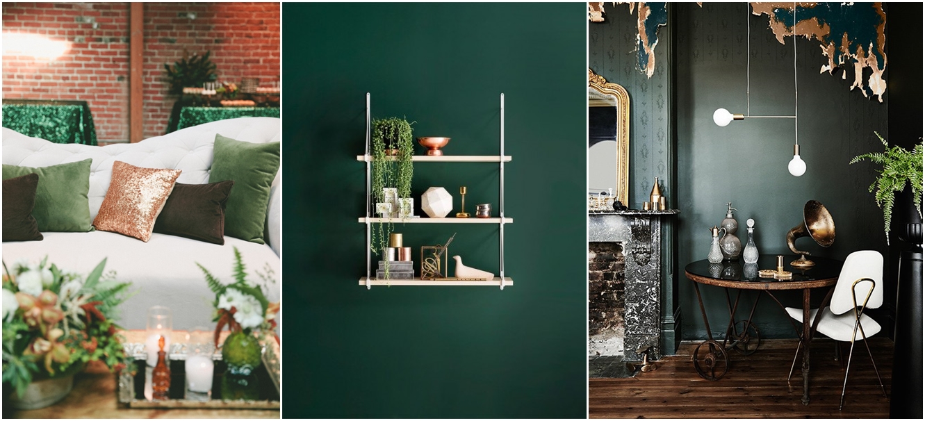 Szmaragdowa zieleń pojawiła się u mnie już w poście o kolorowych kuchniach. Wspominałam wtedy, że pasuje do miedzi. Tym razem postanowiłam Ci to udowodnić 😉 Jest to dość ciężka paleta, która może przytłaczać niektóre wnętrza. Jednak w dużym, dobrze oświetlonym pomieszczeniu powinna sprawdzić się rewelacyjnie. Co więcej, można ją zastosować praktycznie w każdym stylu – idealnie pasuje do wnętrz rustykalnych, czy nawet wypełnionych antykami, ale dobrze wyglądać będzie także w stylu skandynawskim, eklektycznym, a nawet całkiem nowoczesnym. Wszystko zależy od proporcji, jakich użyjemy w danym wnętrzu. Spójrz na zdjęcia!
