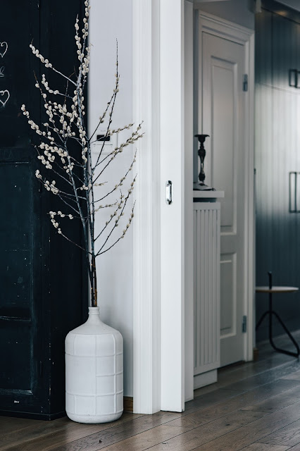 - Krótką ścianę kończącą przedpokój pomaluj na ciemny kolor, resztę zostawiając białą. W ten sposób “zbliży” się ona do wejścia.