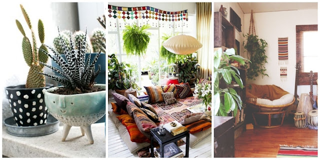 Filozofia dzieci kwiatów zakładała między innymi bliskość z naturą. Z tego względu nie dziwi mnogość kwiatów we wnętrzach w stylu boho. Wypatrzymy w nich głównie rośliny zielone, liściaste, ale także niezwykle popularne ostatnio kaktusy. Duże i małe, tworzą niekiedy swoistą dżunglę w pomieszczeniu. Oczywiście kto co lubi, mnie chyba jednak nie chciałoby się tyle podlewać 😉 Jednak chodzi mi po głowie ostatnio mała rodzinka kaktusów na parapecie…
