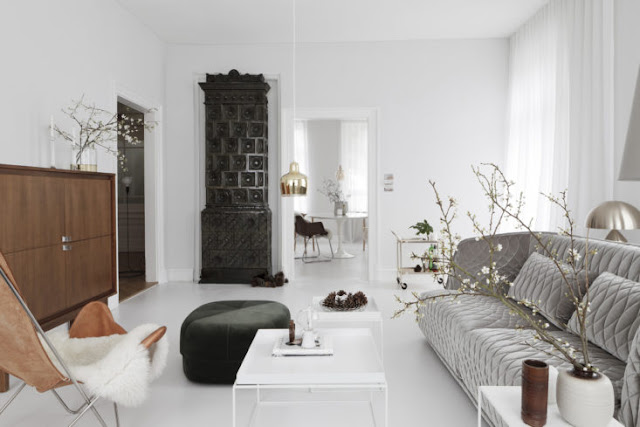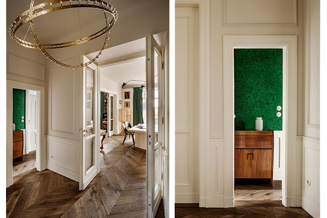Na koniec moje własne przemyślenie – chętnie przyjęłabym takie rozwiązanie w części dziennej, ale do przechodnich garderób, łazienek i gabinetów nie jestem przekonana. No chyba, że mówimy o mieszkaniach w zabytkowych kamienicach, które często oryginalnie posiadają układ przechodni i przepiękne, stare, zdobione drzwi… W takim wnętrzu jak poniżej, pewnie zmieniłabym zdanie 😉