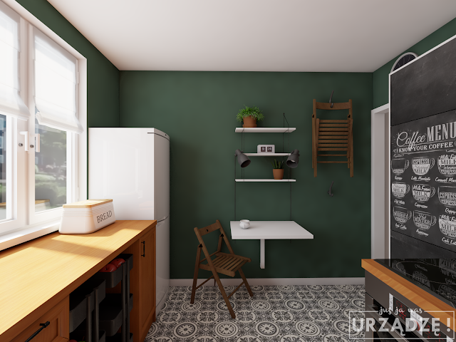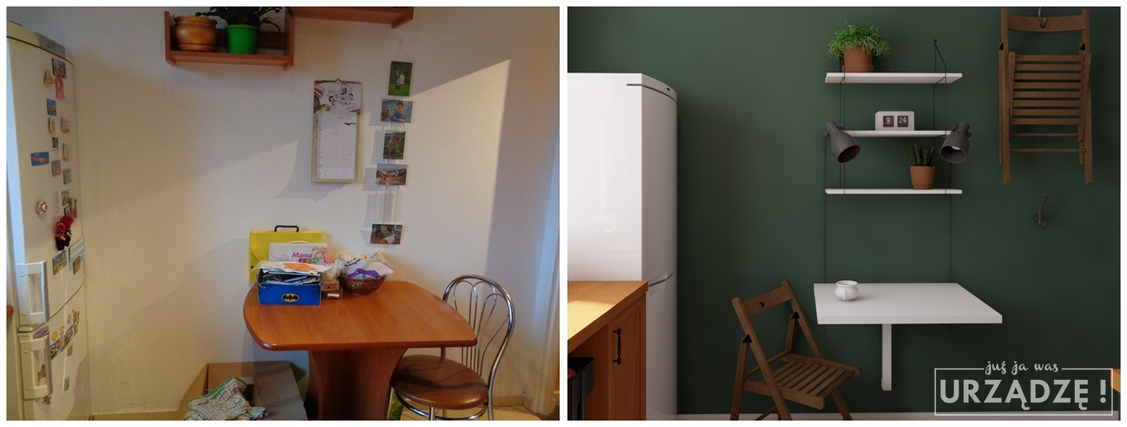 Staroświecki stół, brzydkie, metalowe krzesła, półka pamiętająca poprzednie millenium? Wymień je! U Pani Oli postawiłyśmy na stół montowany do ściany – może służyć za dodatkowy blat, miejsce do wypicia szybkiej kawy, a gdy nie jest potrzebny – złożenie go zajmuje kilka chwil. Do tego nowe, składane krzesła, które można odwiesić na ścianę, a także nowoczesne półki – zarówno nad stołem, jak i nad blatem. Dzięki nim z blatu zniknie część przedmiotów i będzie więcej miejsca na przygotowywanie posiłków.