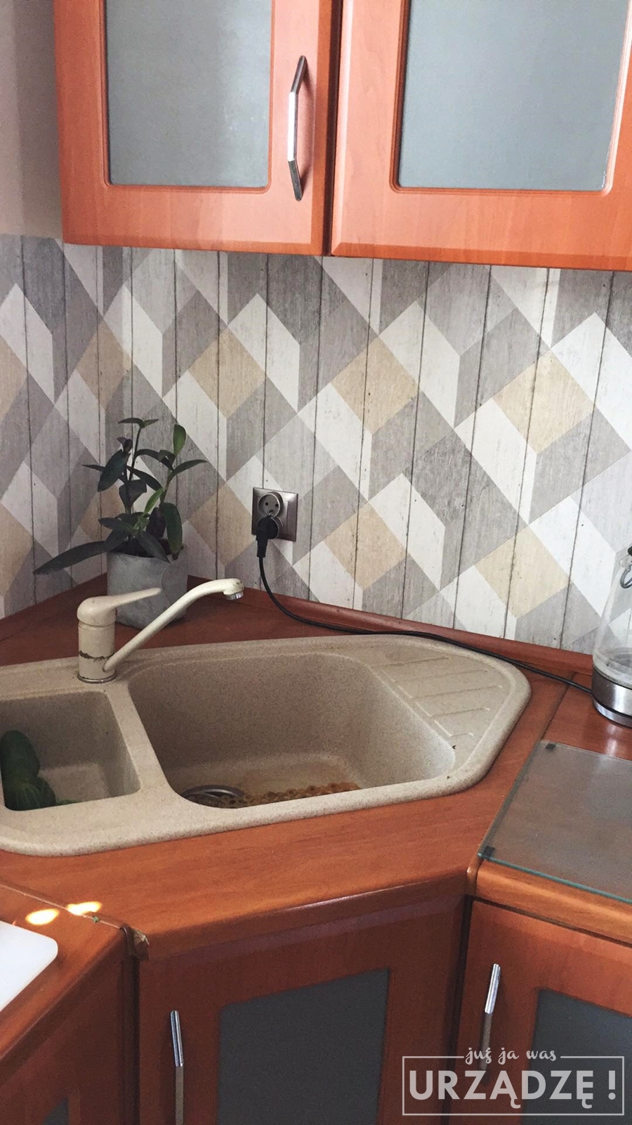 Ten trick wykorzystałyśmy w kuchni mojej mamy, która też ma meble w tym kolorze. Wnętrza frontów ramowych (które wcześniej były bladożółte) pomalowałyśmy na chłodny odcień szarości, a ścianę między szafkami wykleiłyśmy tapetą. Jedno popołudnie, a kuchnia nabrała zupełnie innego klimatu!