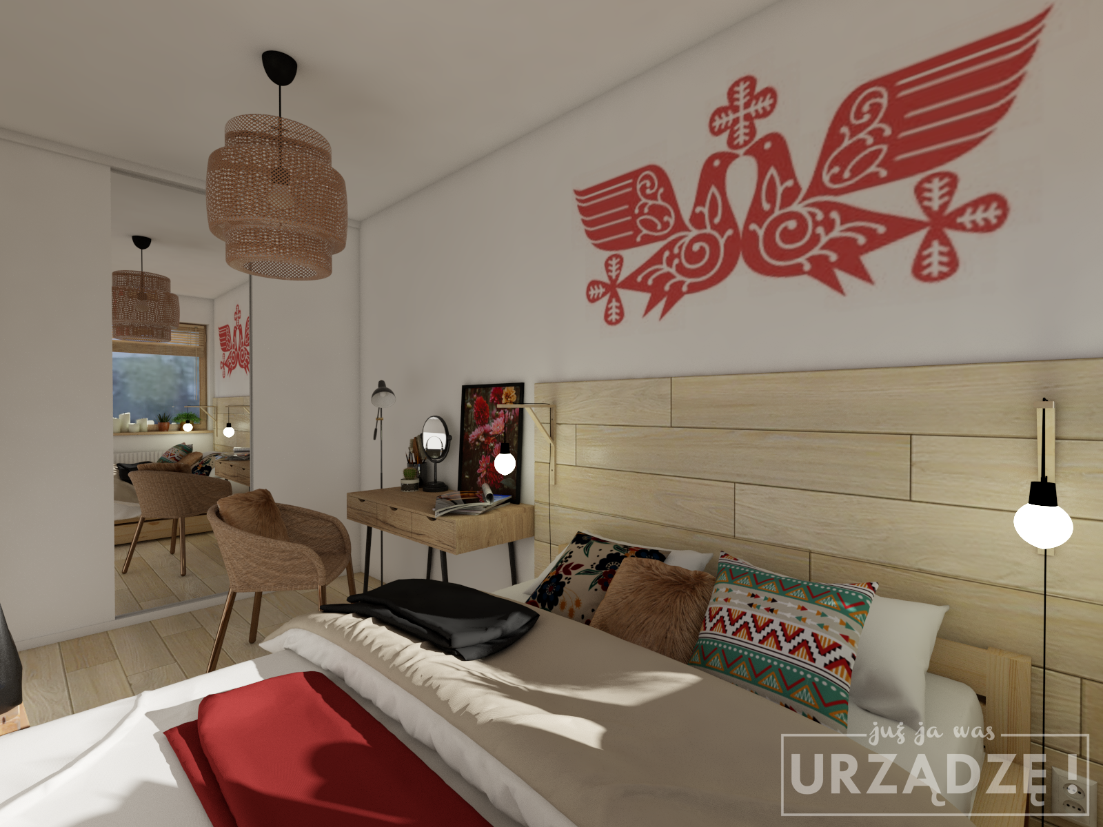 Pamiętaj, że nie musisz tapetować od razu całej ściany. Fajnym pomysłem jest naklejenie 3-4 pasów centralnie za łóżkiem i zostawienie “gołej” ściany przy stolikach nocnych. Możesz też zrobić dokładnie odwrotnie – zacząć tapetowanie od linii łóżka. Dzięki temu stworzysz piękne tło dla wiszących nad stolikami lamp. Możesz też przemyśleć stworzenie lamperii z tapety lub połączyć ją z innymi materiałami – deskami, fornirem lub tapicerowanymi panelami – tak jak na wizce niżej.
