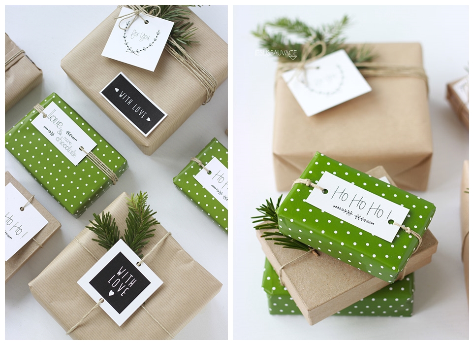 Ozdoby te są stonowane, ale dodatek nasyconego koloru powoduje, że nie są smutne. Na czym można więc przemycić zieleń? Na kolorowym papierze, wstążkach, tagach, świeżych gałązkach albo nawet w formie prawdziwych jabłek. Wszystko w duchu eko. Mnie się podoba.