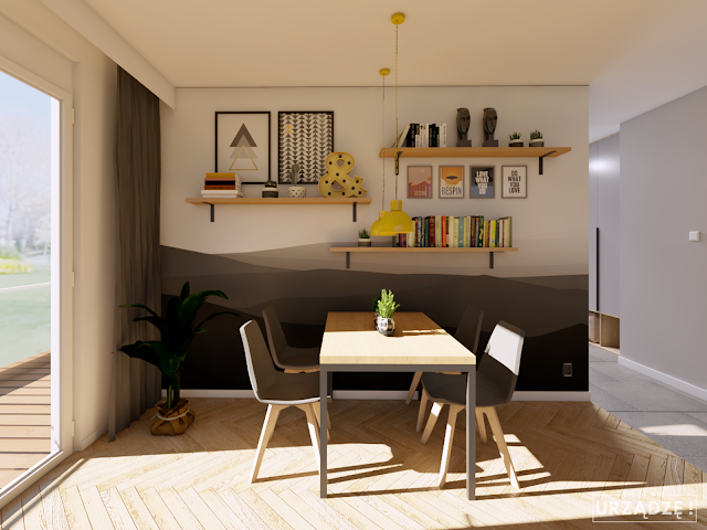 Zdecydowanie wolę, kiedy lampy wiszą na osi symetrii pomieszczenia, niż gdy są rozrzucone przypadkowo po suficie. Zawsze szukam jakiegoś systemu, według którego rozmieszczam punkty świetlne. Dzięki temu unikam wrażenia, które można by nazwać… “tak wyszło” 😉 Ważna sprawa – jeśli w pomieszczeniu mają być zabudowy do sufitu – meble kuchenne, szafy lub regały, podczas projektowania oświetlenia traktuj je jak ściany!