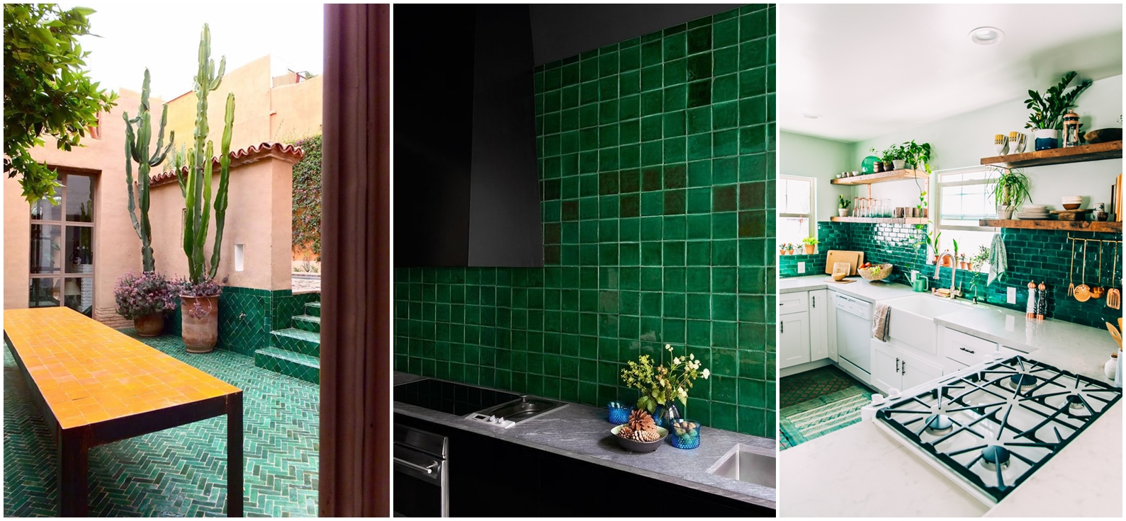 Sama siebie zaskoczyłam, tworząc ten podpunkt, jednak widząc te piękne inspiracje, nie mogłam sobie odpuścić. Te płytki są rewelacyjne! Idealne do łazienki lub kuchni, a jak widzisz na zdjęciach, nawet na taras. W połączeniu z bielą stworzą wrażenie czystości, świeżości, wciąż pozostając ciekawsze, niż standardowa, monochromatyczna glazura. Warto zwrócić uwagę na płytki o oryginalnych kształtach – wszakże mamy nieco większy wybór niż kwadraty, cegiełki i heksagony 😉